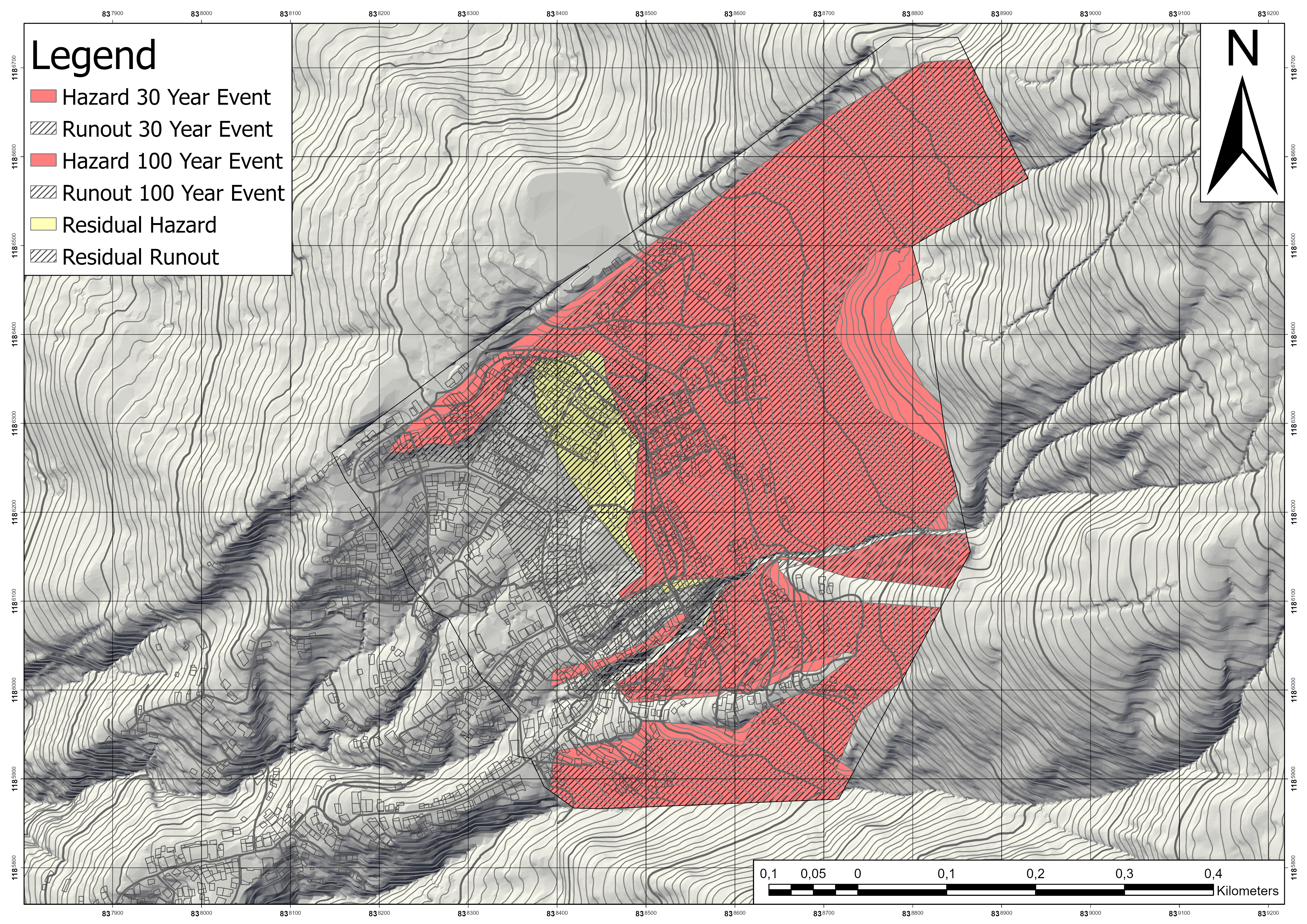 - Hazard Map of Bello Oriente, depicting the high hazard areas (30 year and 100 year event), the residual hazard areas and their runout zones